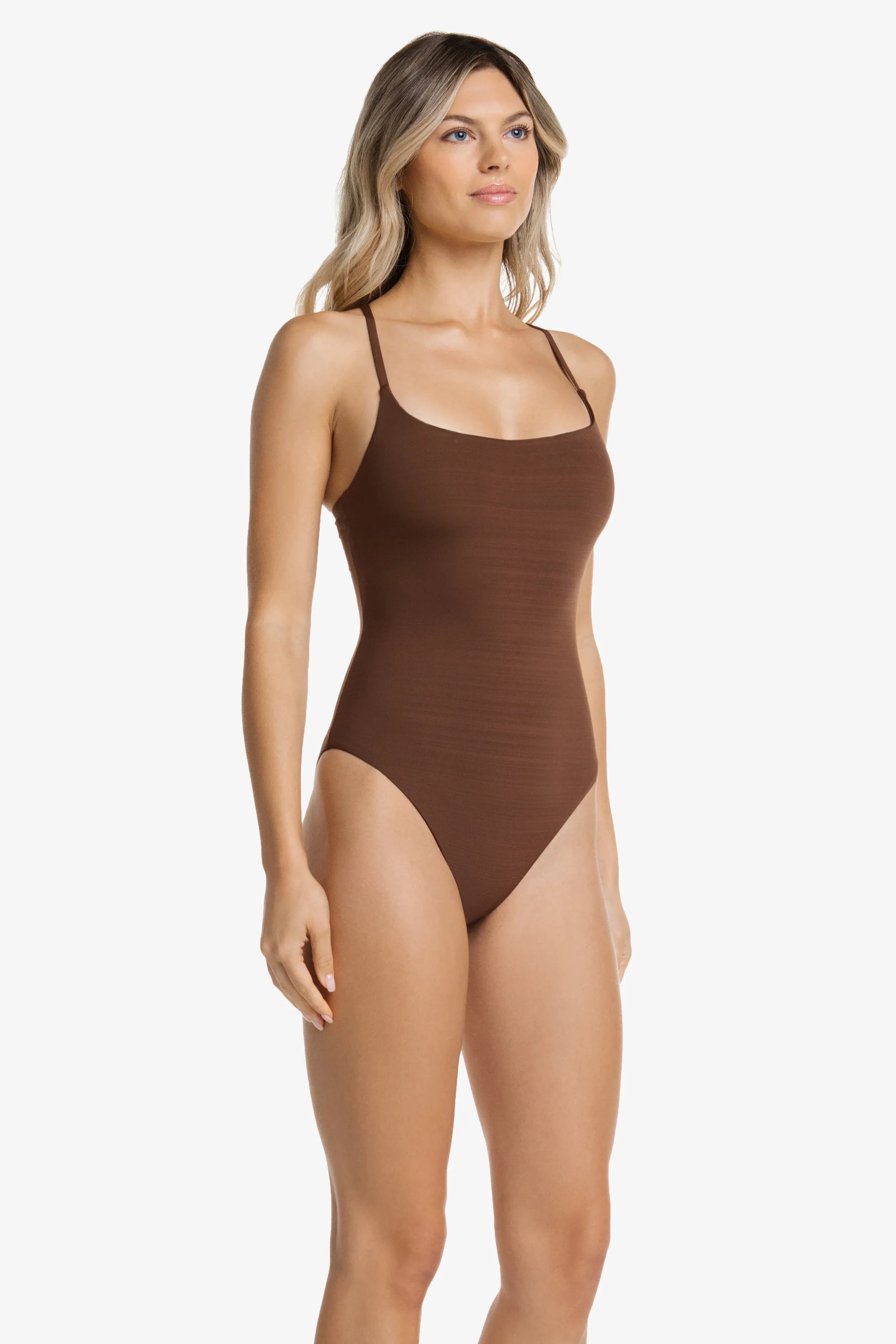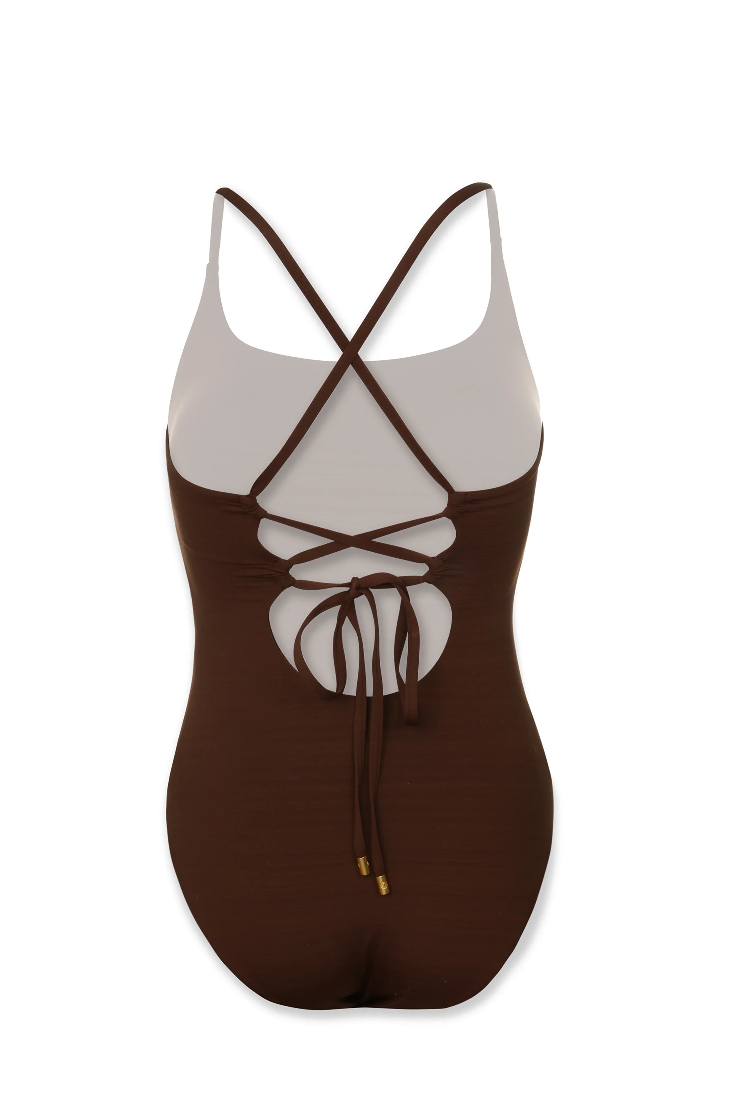 Inspired by chic ballet leotards, the ballet one-piece is the perfect compromise between stylish and modest. With sleek lines in the front and adjustable lace ties in the back, this swimsuit creates a beautiful silhouette that��s so flattering!