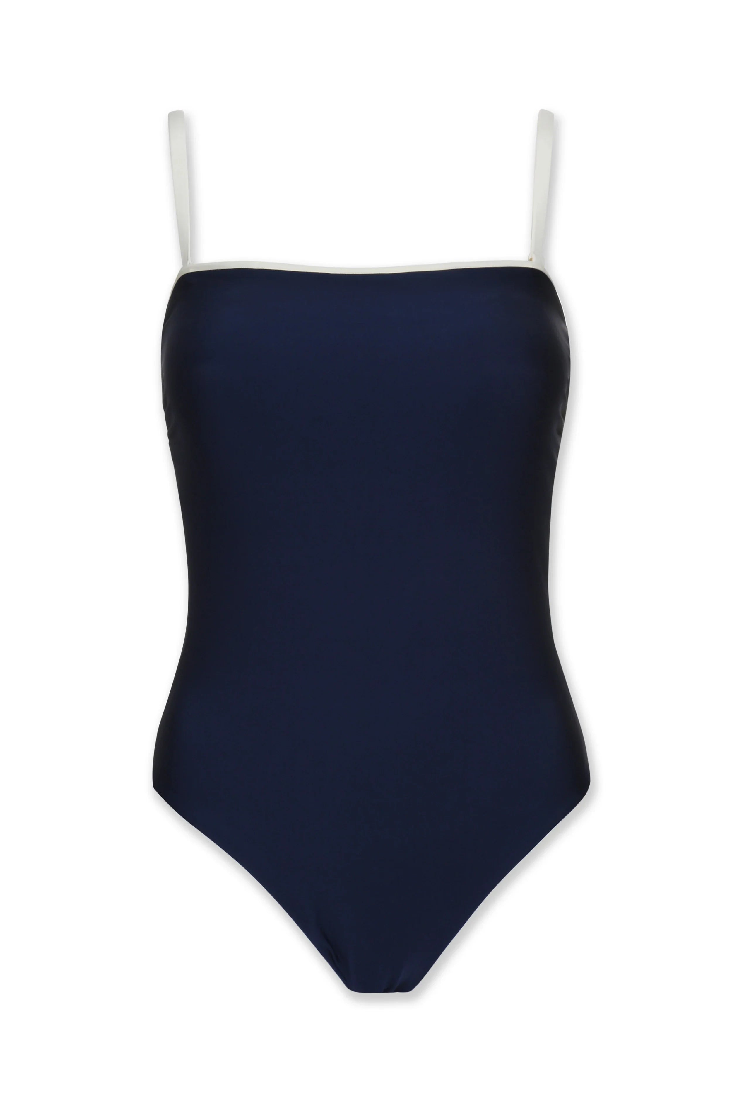 Engineering meets elegance in this full-support bandeau design. The removable cups, detachable shoulder straps, and higher leg cut give you complete control over fit and coverage. Meanwhile, the navy and ivory contrast creates striking color blocking that's anything but ordinary.