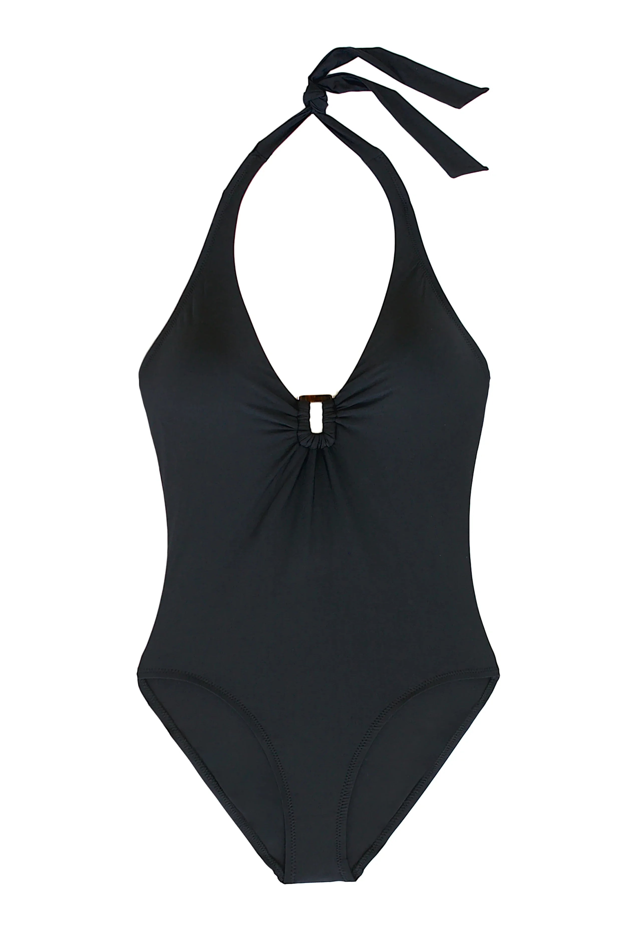 The picture of understated glamour and appeal, our plunge tortoise one-piece features a neckline that is the just the right amount of sexy. With an amazing fit, lovely tortoise hardware, and a rich fabric and feel, you'll always feel beautiful!